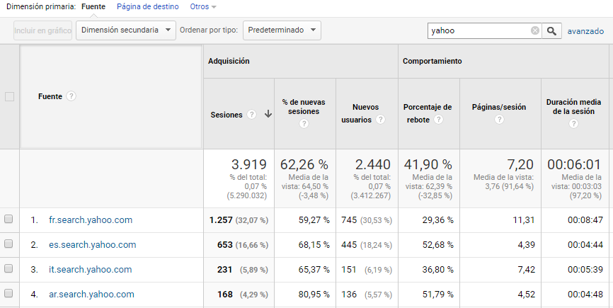 Actualmente Google tiene el 94% de la cuota de mercado en España, por lo que esta mentira es probable que no suponga un cambio significativo en tus datos. Aún así, si estás midiendo los resultados de tus acciones SEO, o si tu tráfico viene de otros países donde Google no tiene tanto mercado (Rusia, China, LATAM…), quizá te interese echar un vistazo a las visitas del tráfico externo.