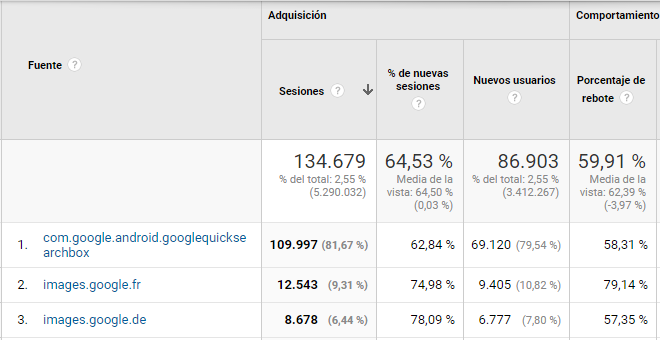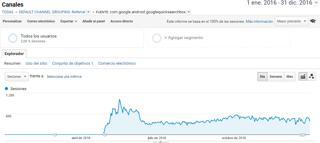 En abril-mayo de 2016 surgió una nueva fuente de referencia en los informes de Google Analytics de muchas webs. Esta fuente, denominada "com.google.android.googlequicksearchbox”, es en realidad tráfico de búsqueda orgánica de la aplicación Google Android. Es decir, son visitas de usuarios de Android (tanto en dispositivos móviles como en tablets) que utilizan la aplicación de Google para buscar y acceder al sitio web. Por lo tanto, es tráfico orgánico que Google está clasificando como externo.