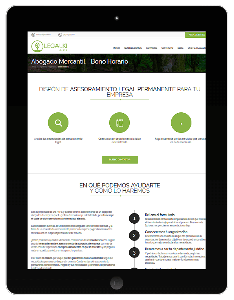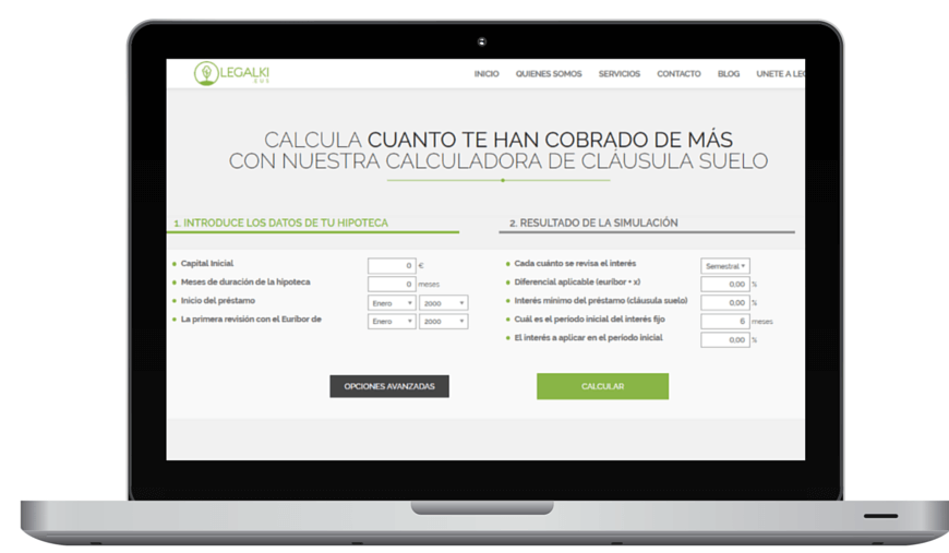 En este sentido la web nace totalmente orientada a atraer y recibir consultas de futuros clientes. Como abogados de cláusula suelo, Legalki se diferencia ofreciendo una calculadora de cláusula suelo gratuita, que permite a cualquiera calcular de forma inmediata si nuestro banco nos ha cobrado de más en nuestra hipoteca. Este tipo de activos permiten ofrecer valor al cliente incluso antes de que este contrate algún servicio.